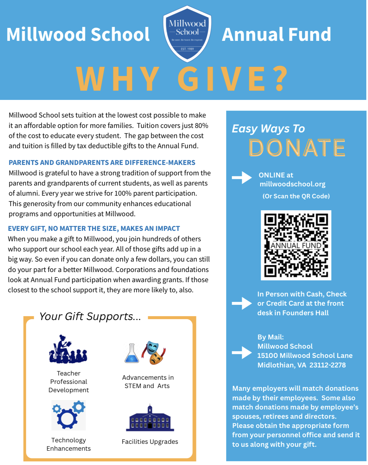 Each year, the Millwood School community comes together to support our Annual Fund, the single most important way you can support Millwood. It is an exciting time of year, as our entire Millwood family reflects on what makes Millwood special. You can see the tangible results of your gifts by walking the halls of Millwood School. Each dollar we raise covers the remaining operating expenses and extras that go into providing the outstanding education our children are receiving at Millwood School. In a way, every student receives financial support. That’s why schools need annual funds, endowments, tuition aid programs, and capital campaigns.